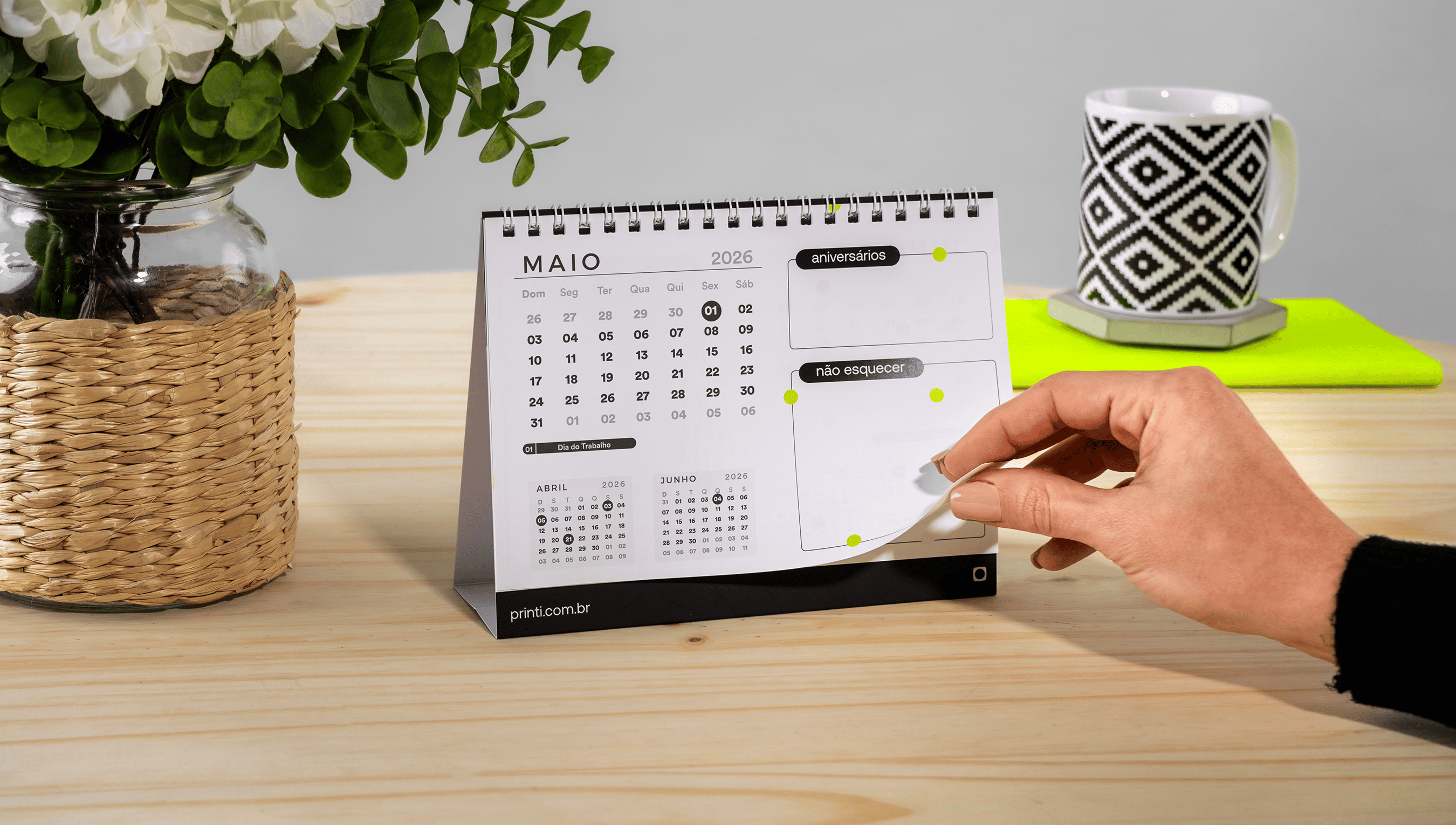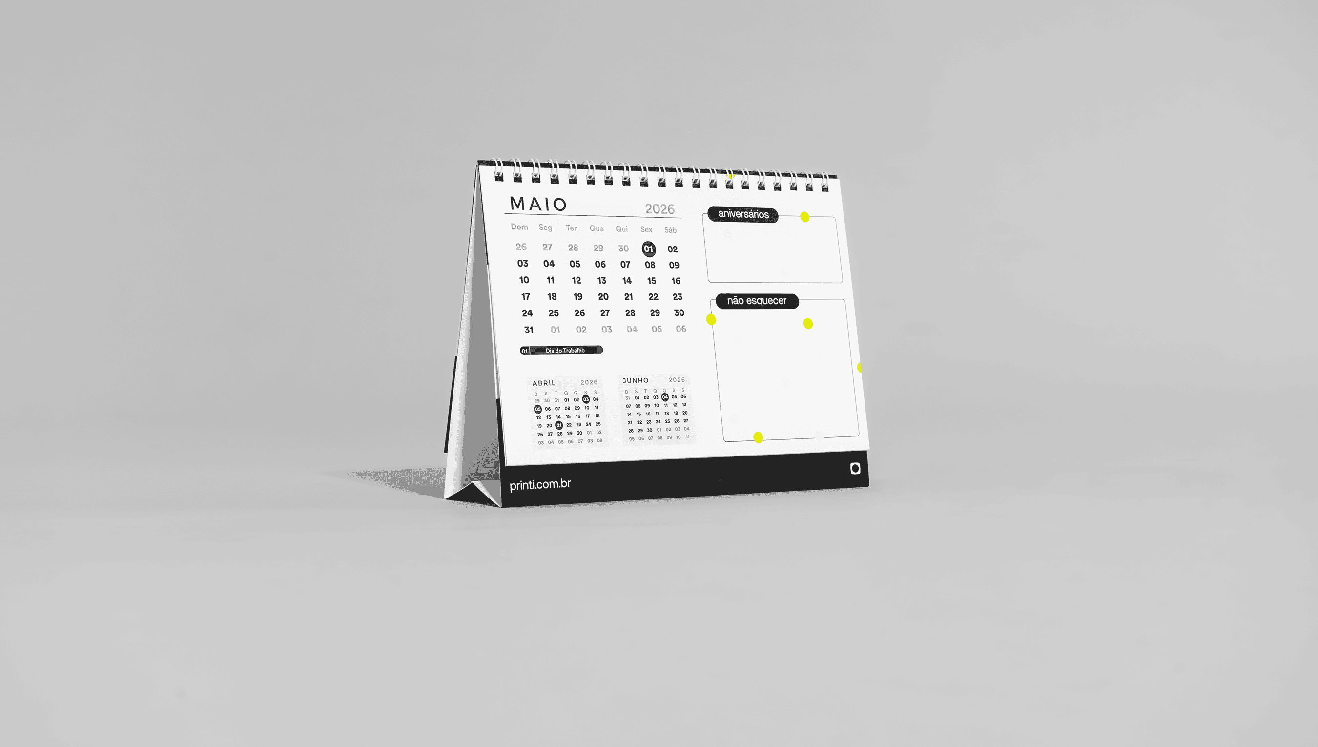 Calendário de mesa 2026 personalizável, ideal para promoções comerciais. Variedade de layouts e acabamentos de qualidade pela Printi.