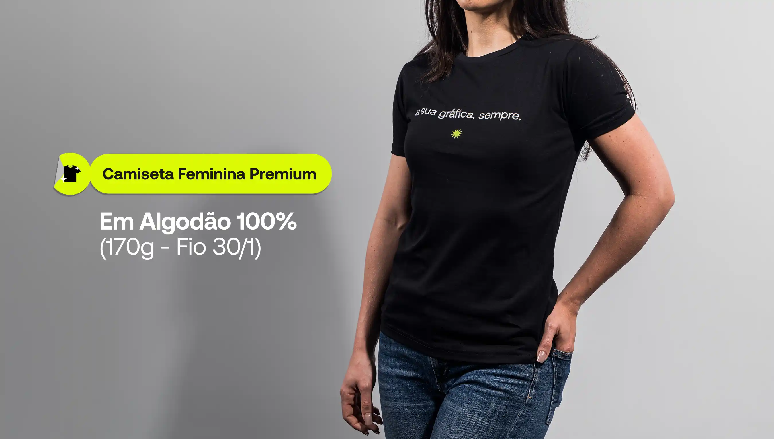 Camiseta feminina premium personalizada com tecido confortável e acabamento refinado. Indicada para representar sua marca em ações internas, eventos e brindes.
