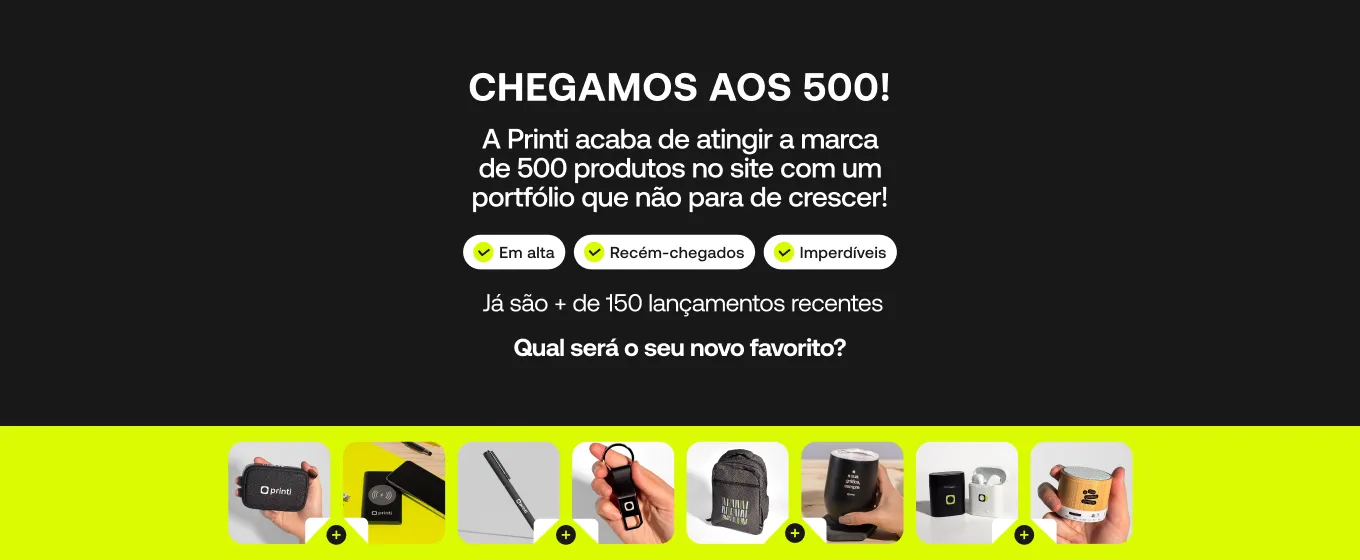 A Printi está sempre inovando com lançamentos frequentes para atender às suas necessidades de personalização. Explore nosso portfólio e descubra produtos que podem fortalecer sua comunicação visual e elevar sua marca a um outro patamar!