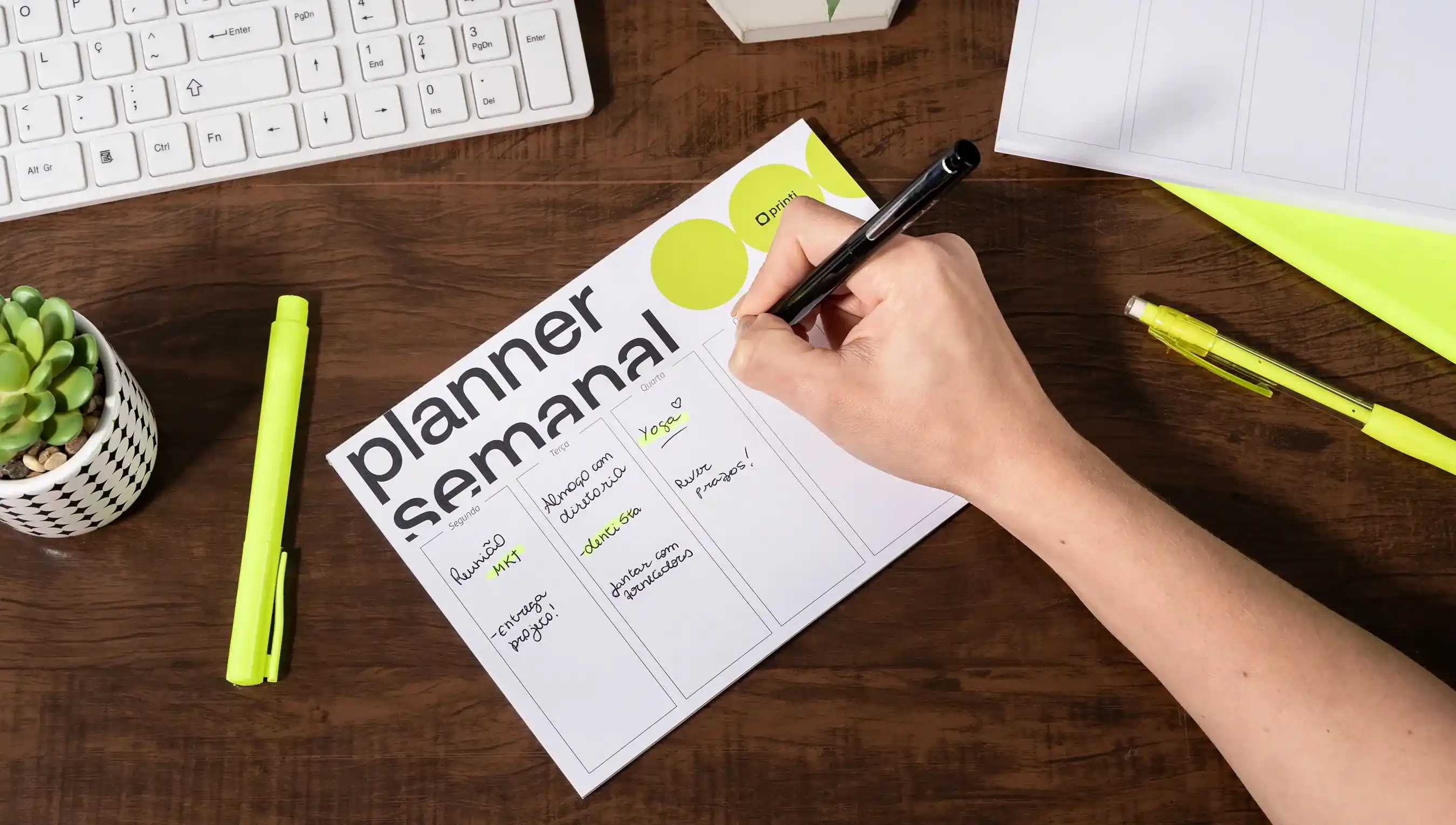 Personalize seu planejamento semanal com estilo, aumentando produtividade e focando em metas e desafios diários.