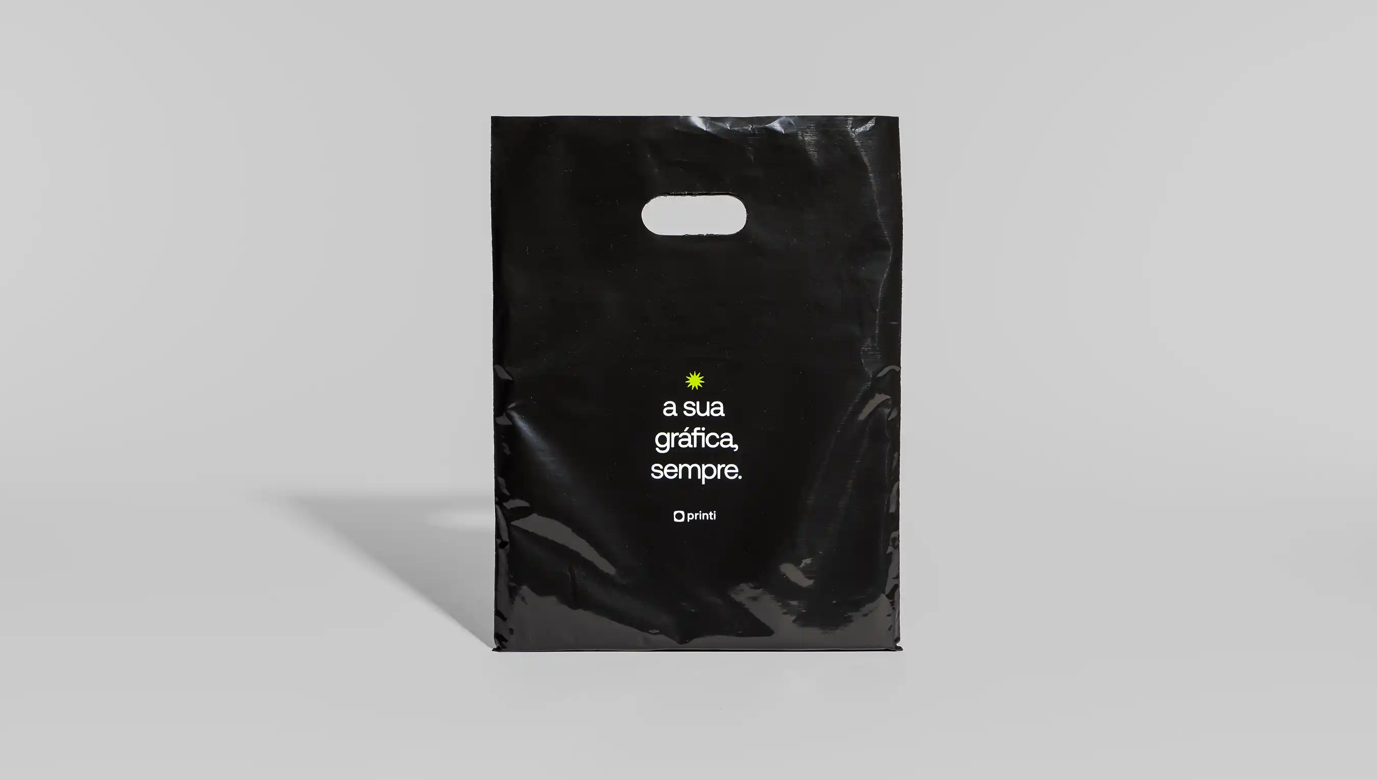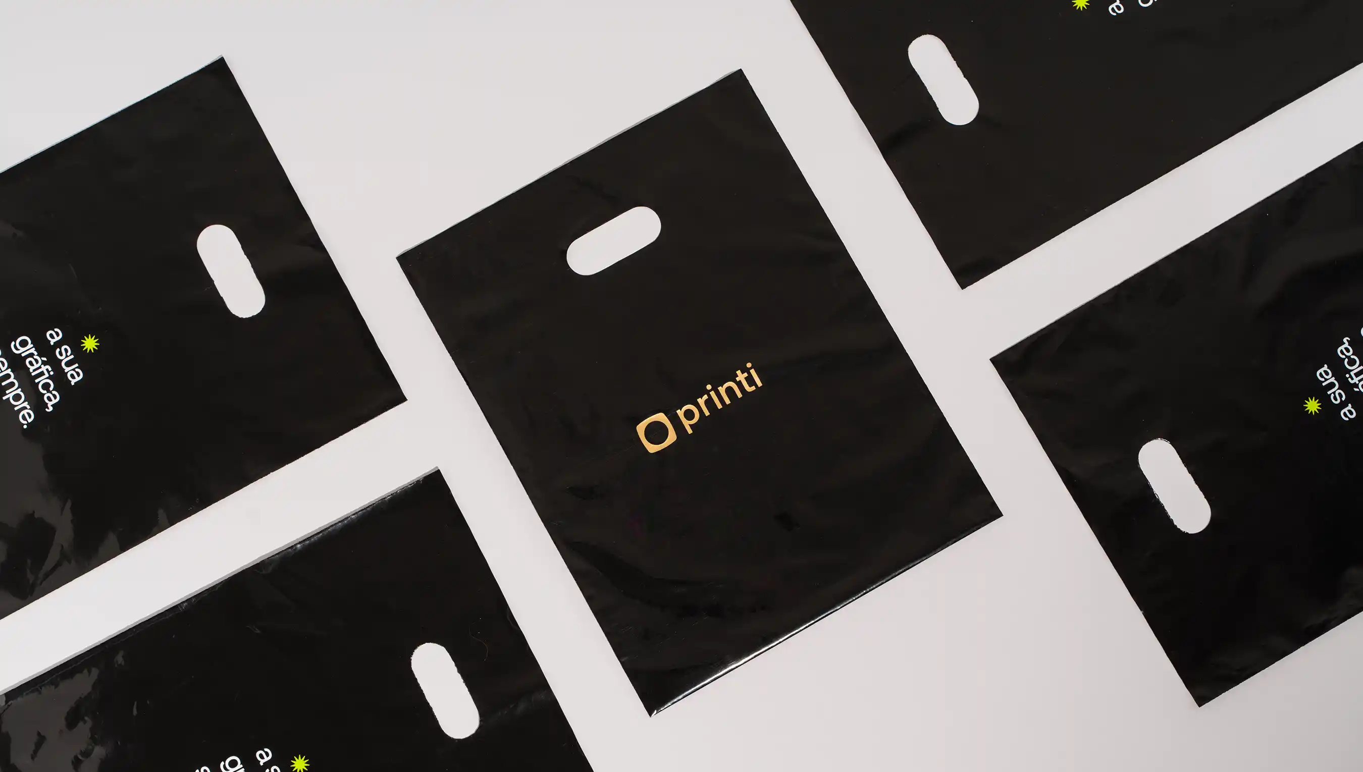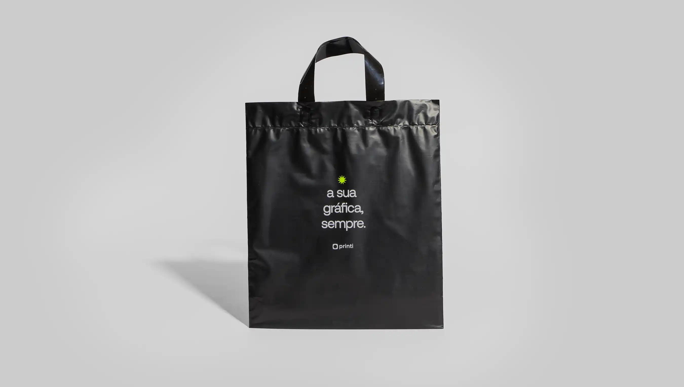 Sacola plástica personalizada com alça vazada ou fita, conhecida como sacola boca de palhaço. Ideal para promoções, eventos e brindes personalizados.