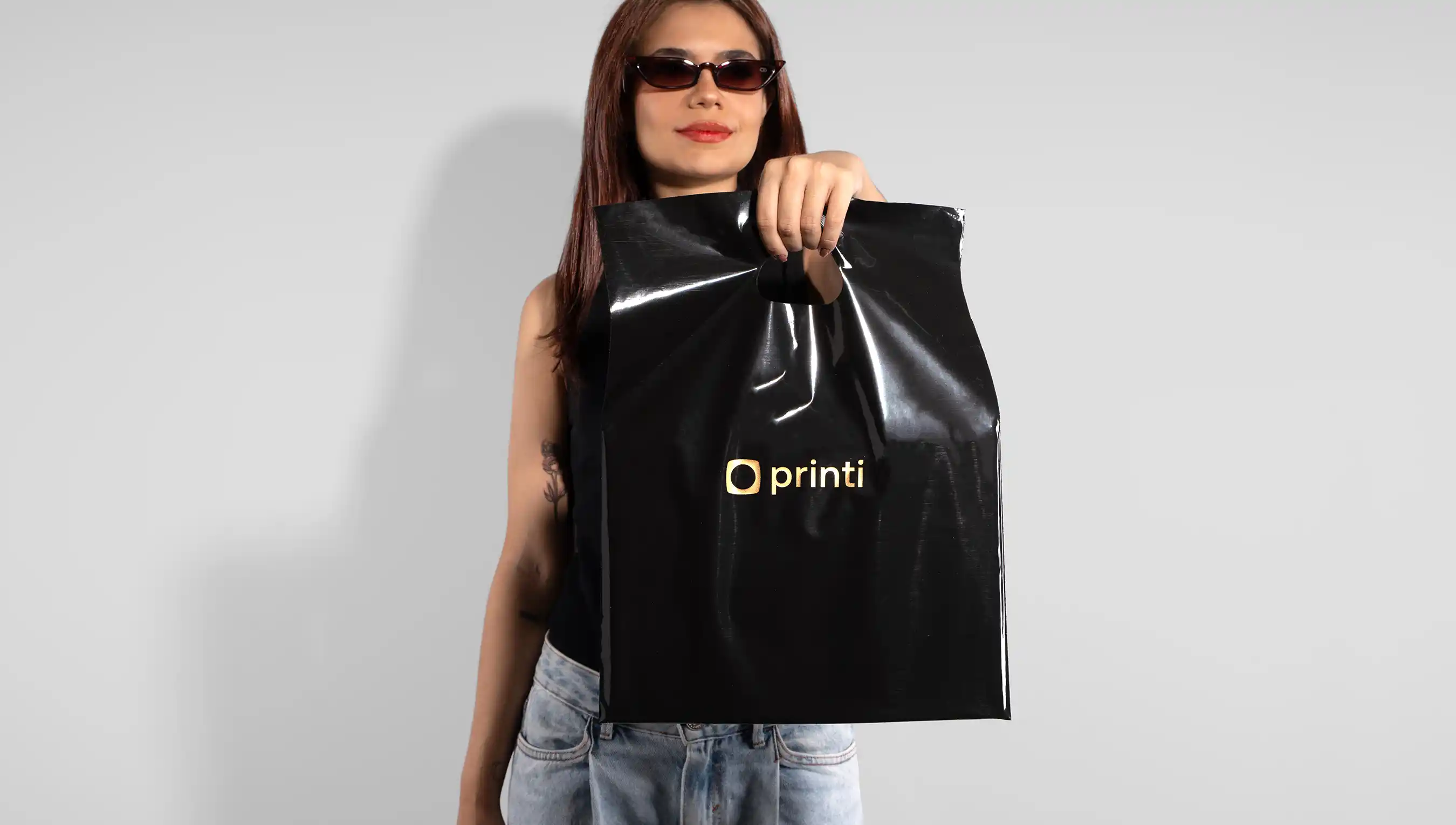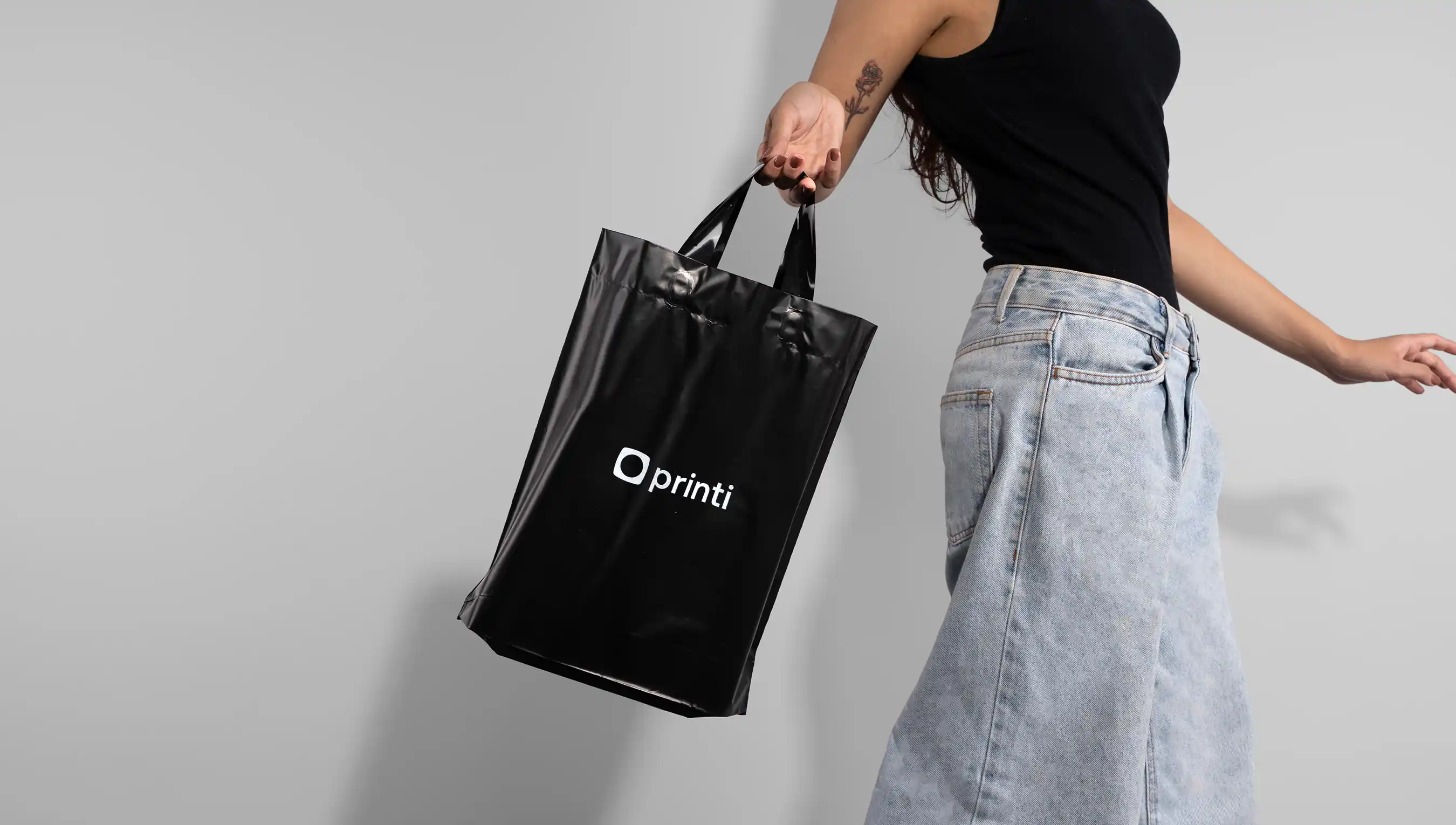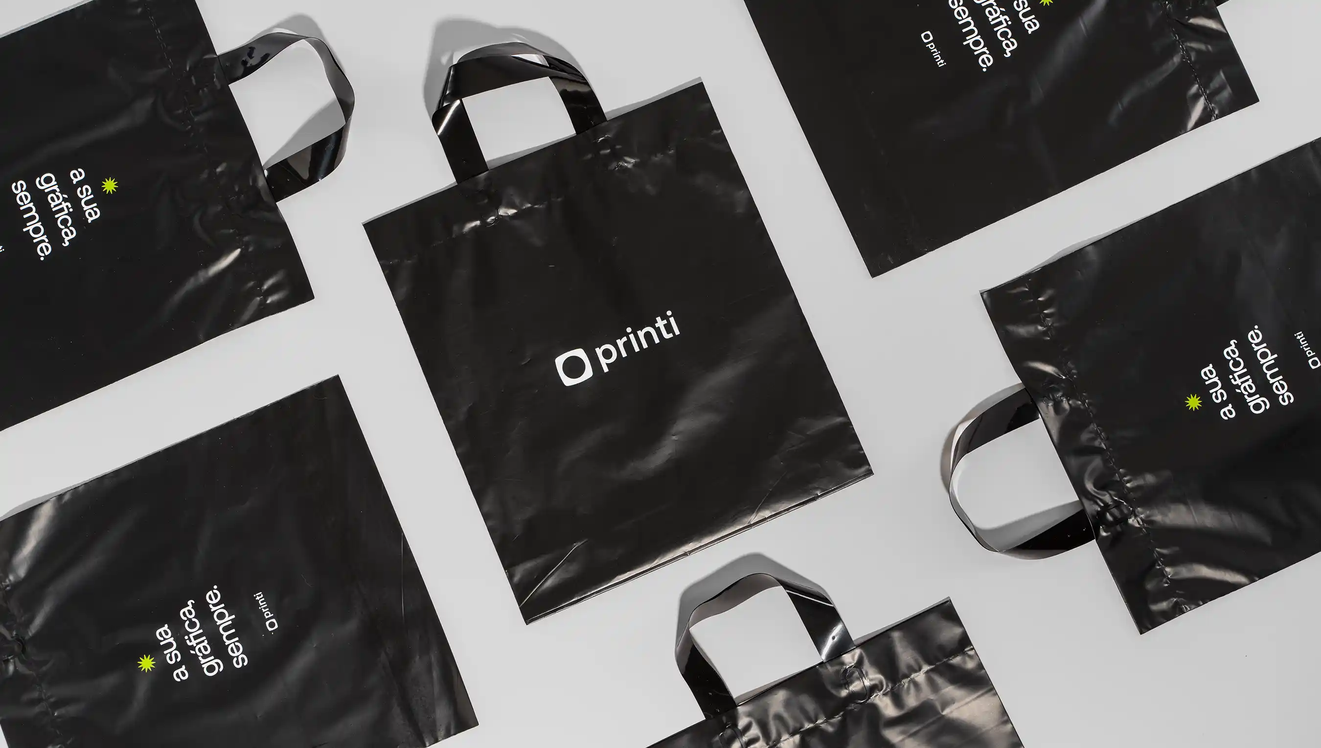 Sacola plástica personalizada com alça vazada ou fita, conhecida como sacola boca de palhaço. Ideal para promoções, eventos e brindes personalizados.